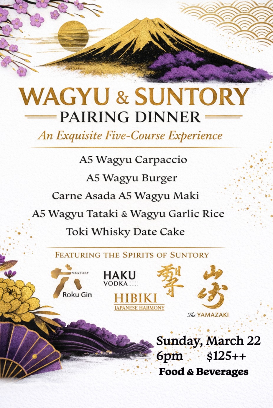 Join us for an intimate evening celebrating the exceptional pairing of Japanese A5 Wagyu and the renowned spirits of Suntory. This limited-seating dinner features a thoughtfully curated multi-course tasting menu highlighting the depth, texture, and versatility of A5 Wagyu prepared in a variety of styles—from delicate, refined presentations to warm, savory compositions.